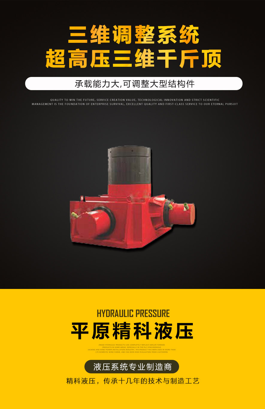 三维调整液压系统主要由三维千斤顶、同步调整液压系统、位移检测系统以及管路附件组成,是一种起重位移的专用工具。三维千斤顶主要结构是由三个双作用超高压千斤顶、结构支撑体以及滑道组成。主顶升千斤顶配有液压安全阀用于保护负载。